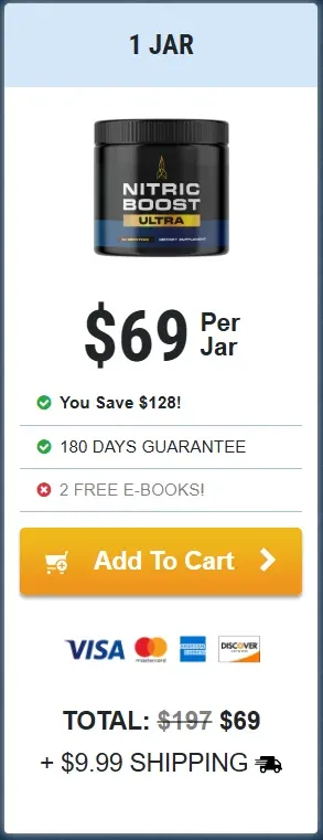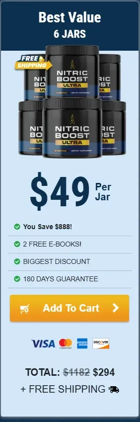 Nitric Boost is effective for men in their 30s, 40s, 50s, and even 70s. It’s produced in a facility that follows FDA and GMP regulations. The manufacturer offers a 180-day money-back guarantee, discounts on each package, and free shipping when you purchase multiple bottles.